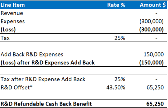 Explained briefly, if your company has enough current or accumulated losses (losses from prior operating years) available then the R&D tax incentive allows the company to “dip into” its losses and “cash them in” in the current year as opposed to waiting until future, profit making years, in order to not pay tax.